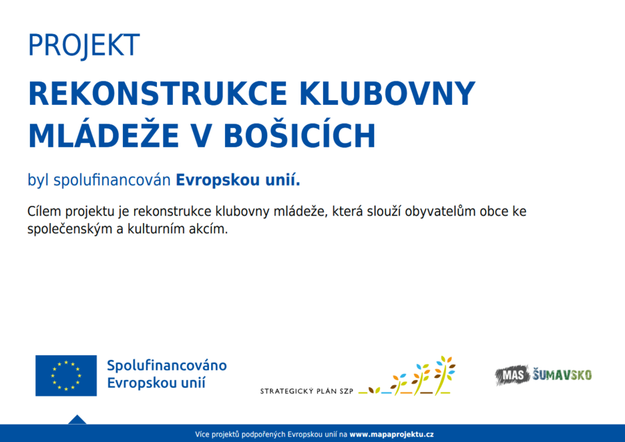 Projekt REKONSTRUKCE KLUBOVNY MLÁDEŽE V BOŠICÍCH je spolufinancován Evropskou unií. Podpora projektů konečných žadatelů naplňující cíle SCLLD MAS Šumavsko, z.s.